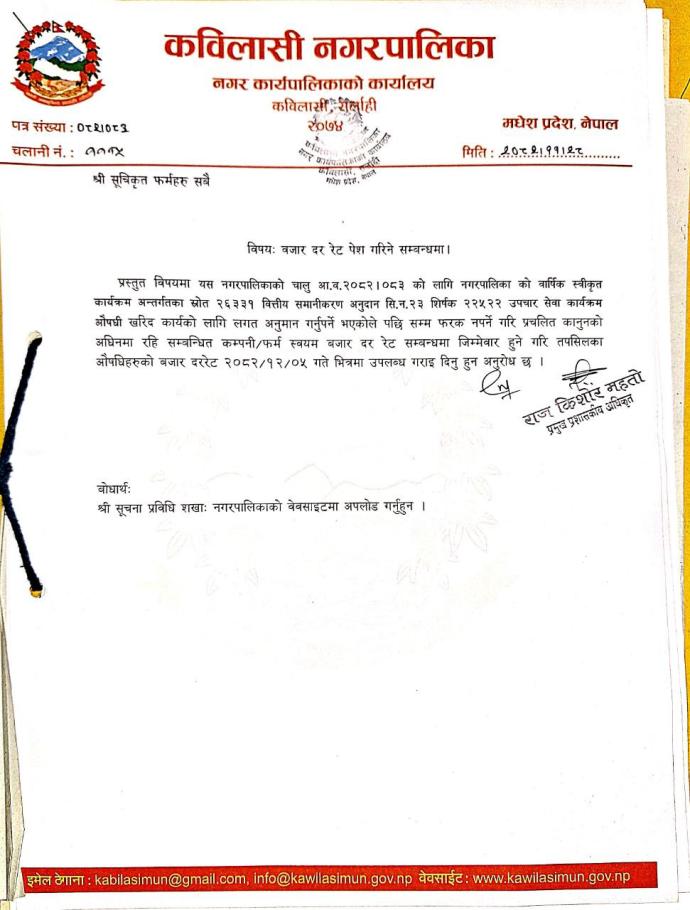 औषधि खरिदका लागि बजार दररेट पेश गर्ने सम्बन्धी सूचना ।