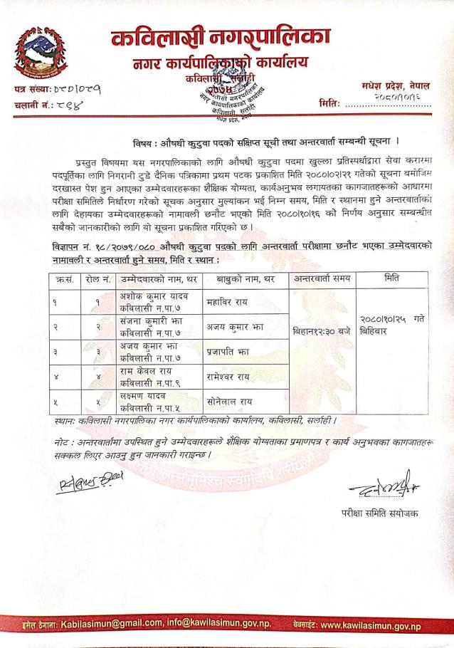 » औषधी कुटुवा पदको संक्षिप्त सूची तथा अन्तरवार्ता सम्बन्धी सूचना |