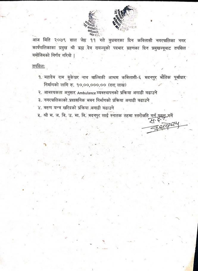 कविलासी नगरपालिकाको नवनिर्वाचित नगर प्रमुख ‌‌‌श्री ब्रहम देव रायज्यू पदभार ग्रहण गर्नु भएको दिन प्रमुख ज्यूबाट निर्णय गरियो |