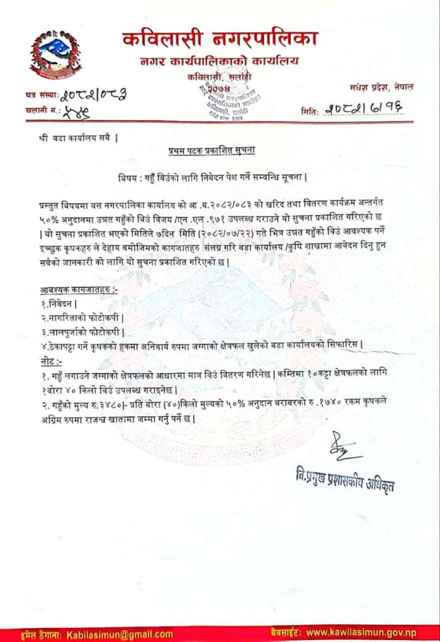 गहुँ बिउको लागि निबेदन पेश गर्ने सम्बन्धी सूचना |