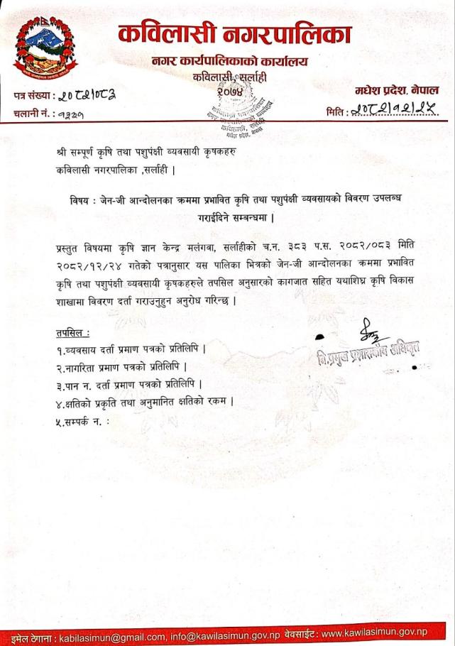 जेन-जी आन्दोलनका क्रममा प्रभावित कृषि तथा पशुपंक्षी ब्यबसायको विवरण उपलब्ध गराई दिने सम्बन्धी सूचना |