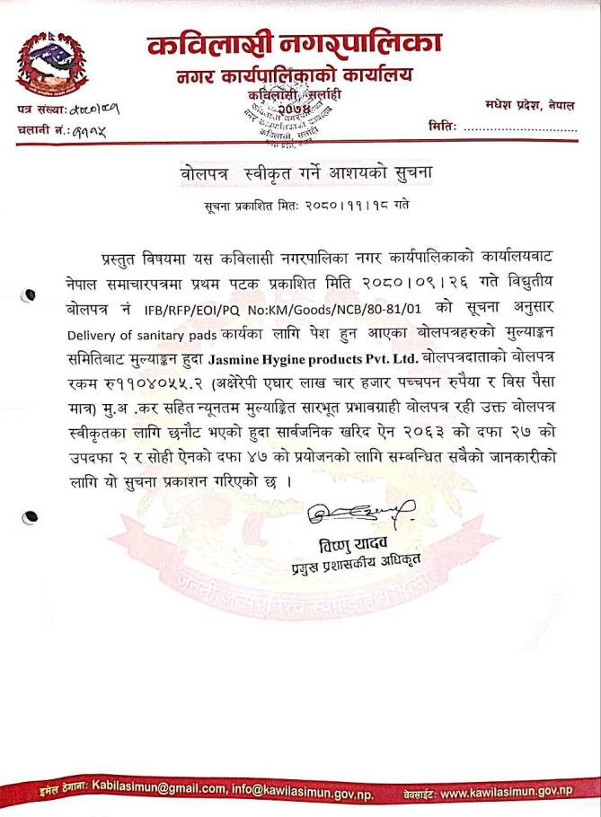 बोलपत्र स्वीकृत गर्ने आशय पत्र सम्बन्धि सूचना |