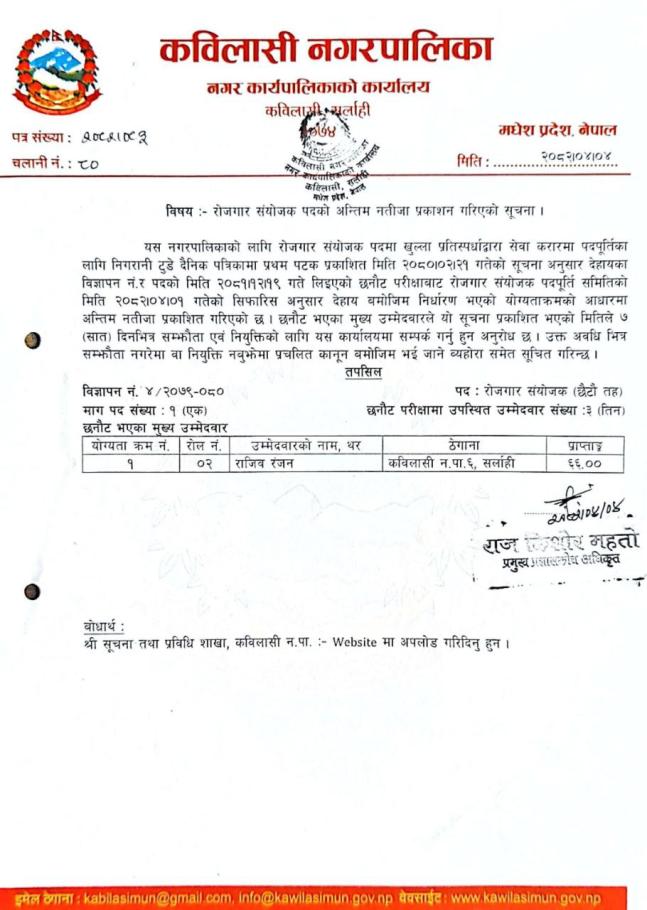 रोजगार संयोजक पदको अन्तिम नतिजा प्रकाशन गरिएको सूचना |
